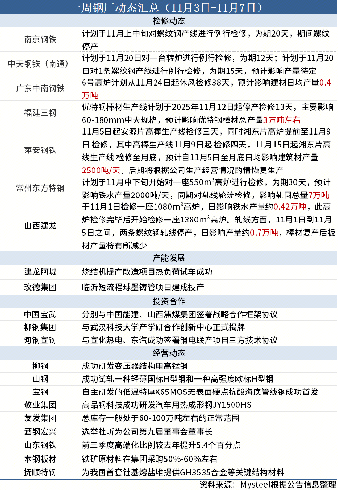 據(jù)Mysteel不完全統(tǒng)計,本周(11月3日-11月7日)7家鋼廠發(fā)布檢修信息,具體如下: