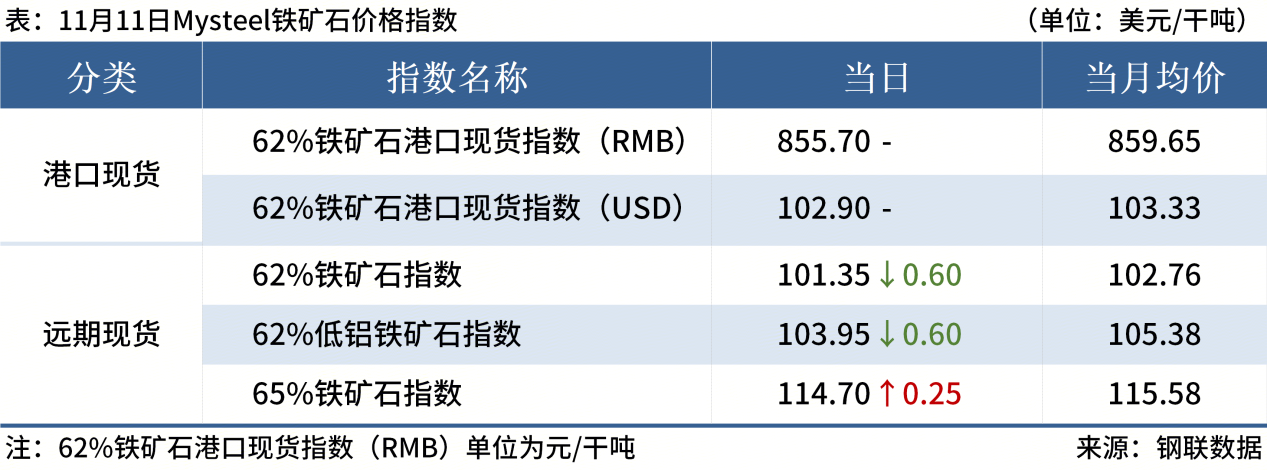 ◎ 11月11日,全國主港鐵礦石成交107.80萬噸,環(huán)比減7.1%;237家主流貿(mào)易商建筑鋼材成交9.10萬噸,環(huán)比減15.6%。