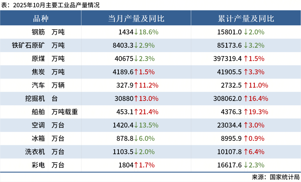◎國家統(tǒng)計(jì)局最新數(shù)據(jù)顯示,2025年10月份,中國鋼筋產(chǎn)量為1434.0萬噸,同比下降18.6%;1-10月累計(jì)產(chǎn)量為15801.0萬噸,同比下降2.0%。其他主要工業(yè)品情況如下: