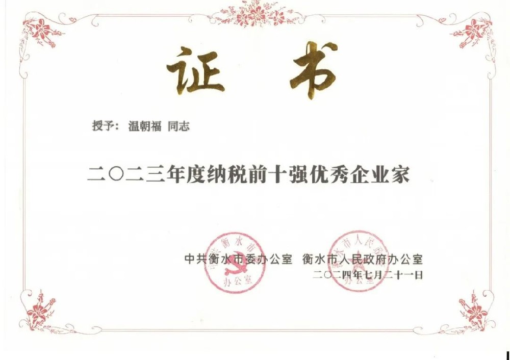 7月21日,衡水市召開了2024年“衡水企業(yè)家日”大會,衡水市委書記吳曉華出席并講話。衡水市領(lǐng)導趙志強、王金剛、鈕興輝、劉軍波、劉立斌、申文霞、張曉雁、靳宏亮出席。副市長孫文欣宣讀了《關(guān)于對2023年度國家制造業(yè)單項冠軍企業(yè)及優(yōu)秀企業(yè)家進行表揚的通報》。對2023年度在全市經(jīng)濟社會發(fā)展中作出重要貢獻的優(yōu)秀企業(yè)家進行表彰,并頒發(fā)了榮譽證書。公司總經(jīng)理溫朝福被授予“納稅前十強優(yōu)秀企業(yè)家”。